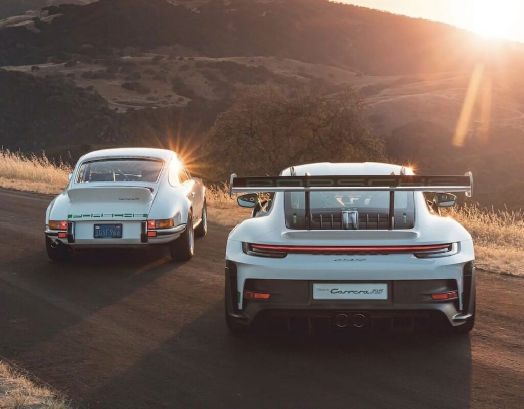 2023 Porsche 911 GT3 RS is powered by a naturally aspirated boxer six-cylinder displacing 4000cc and good for 518 hp @ 9000 rpm paired with a seven-speed PDK dual-clutch automatic transmission. Whereas the original 1972 911 Carrera RS was powered by a 210 PS flat six.