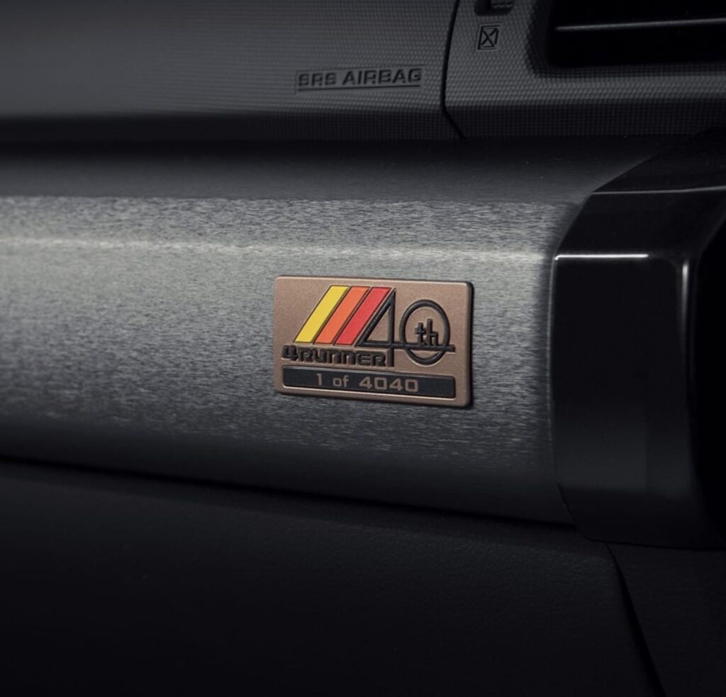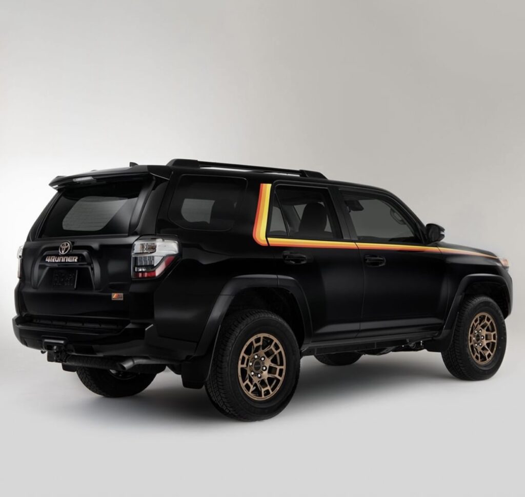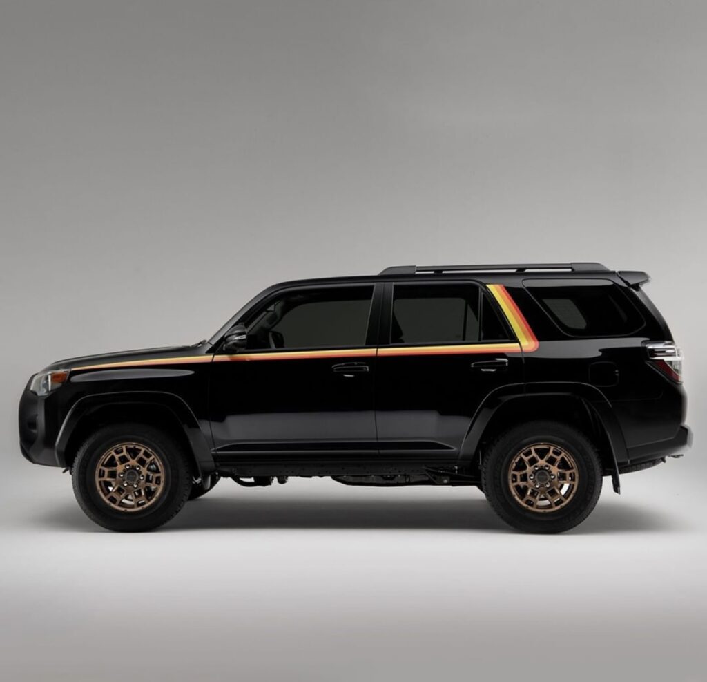 The 2023 Special Edition is based on 2023 4Runner SR5 with unique tri-color stripes and bronze wheels. Special Edition model is limited to just 4,040 units and features unique bronze-colored 17-inch rims, tri-colored stripes on its body and TRD Pro’s heritage grille with “Toyota” badge. The retro SUV is offered in White, Midnight Black Metallic, and Barcelona Red Metallic with attractive retro stripes especially the classic Toyota yellow-orange-red combo. Interior, you get unique stitching, bronze accents and Special Edition badging.