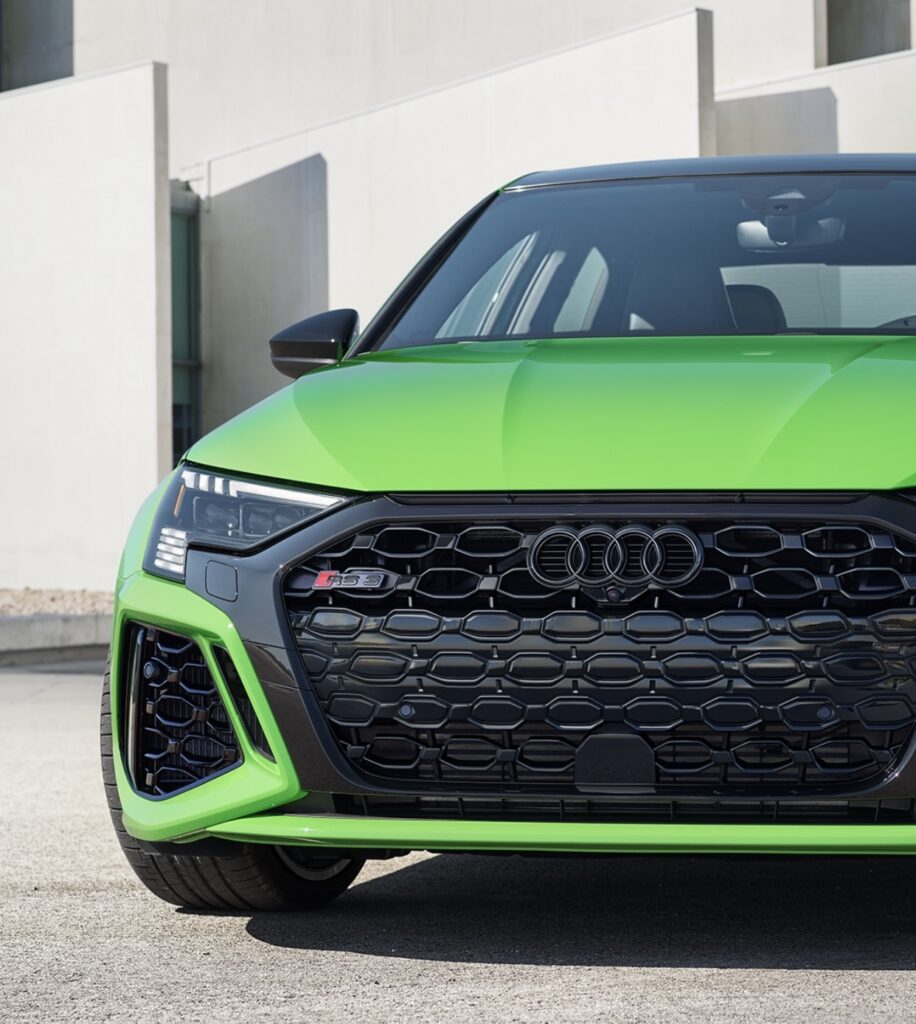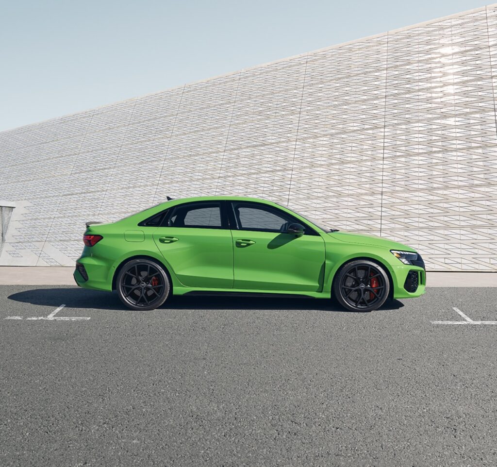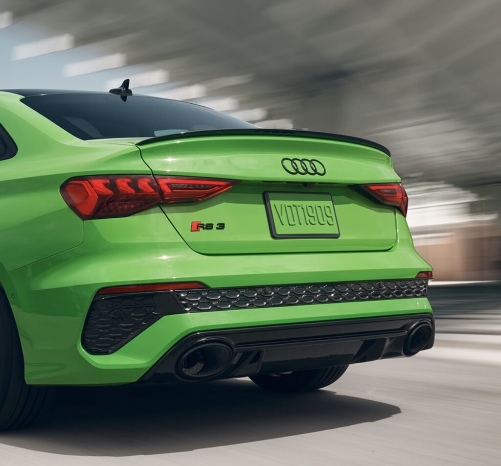 RS3, the compact luxury sedan from Audi is powered by a 401 hp turbo-charged 2.5-liter five cylinder engine.