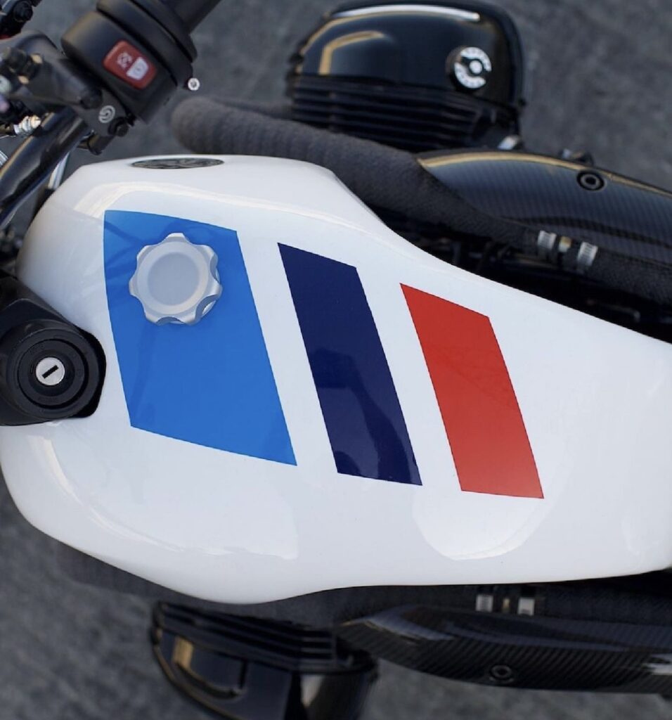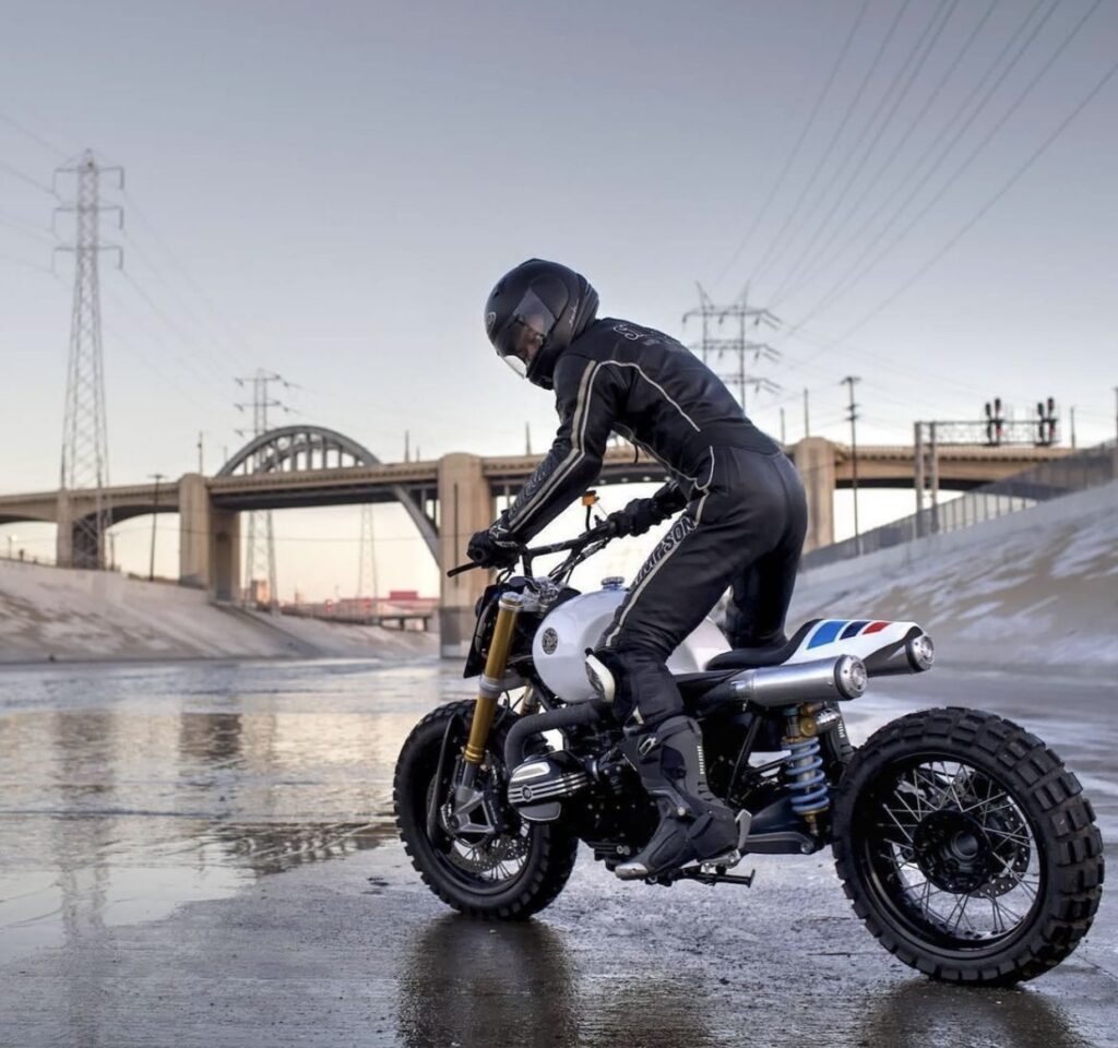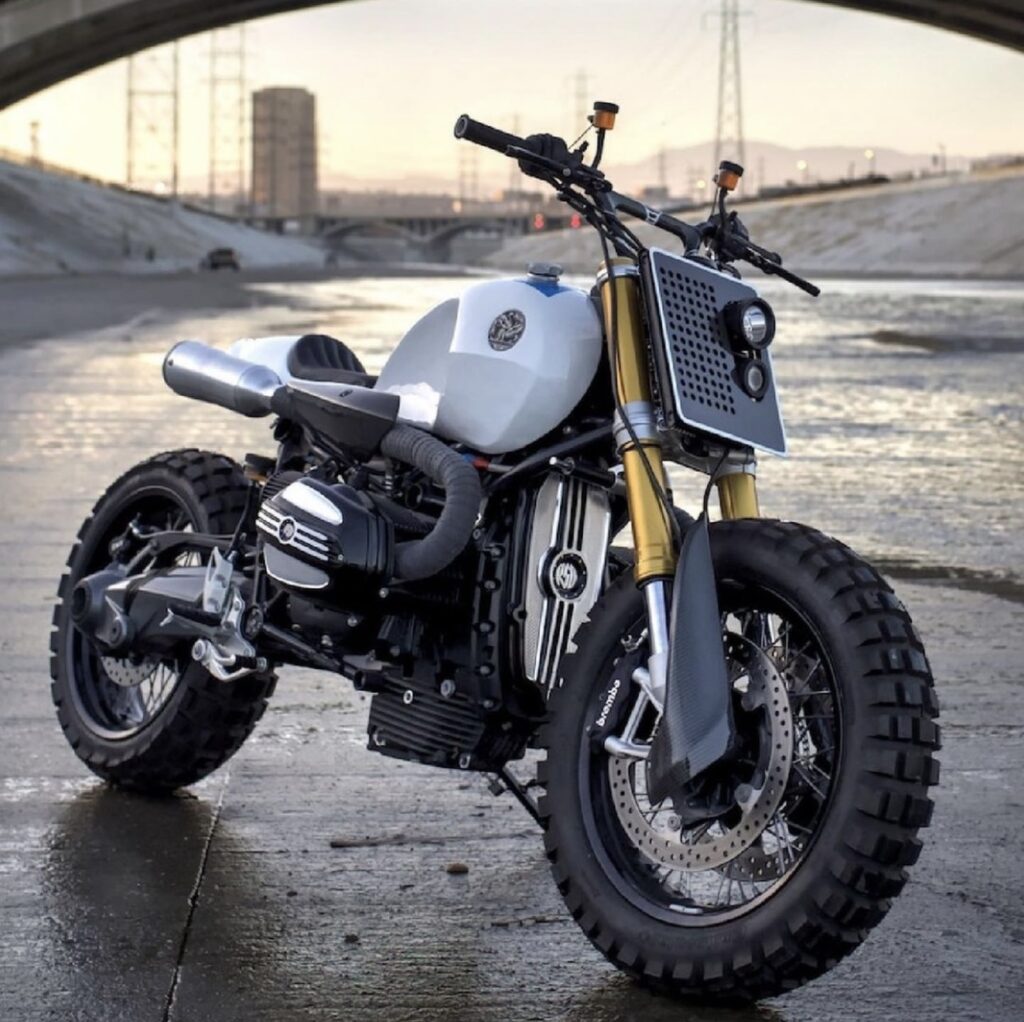 Custom R nineT is equipped with carbon fiber BMX style V-Bar, customized tail fairing and aluminum petrol tank. Chocolate Slider is a cutting edge scrambler ready for wild fun.