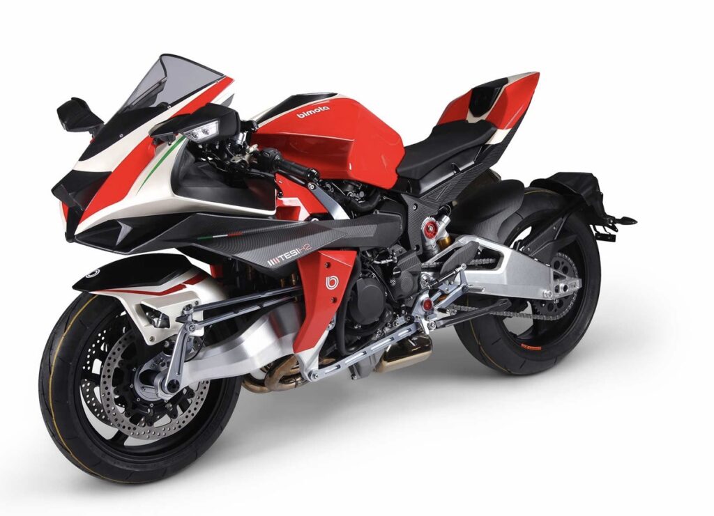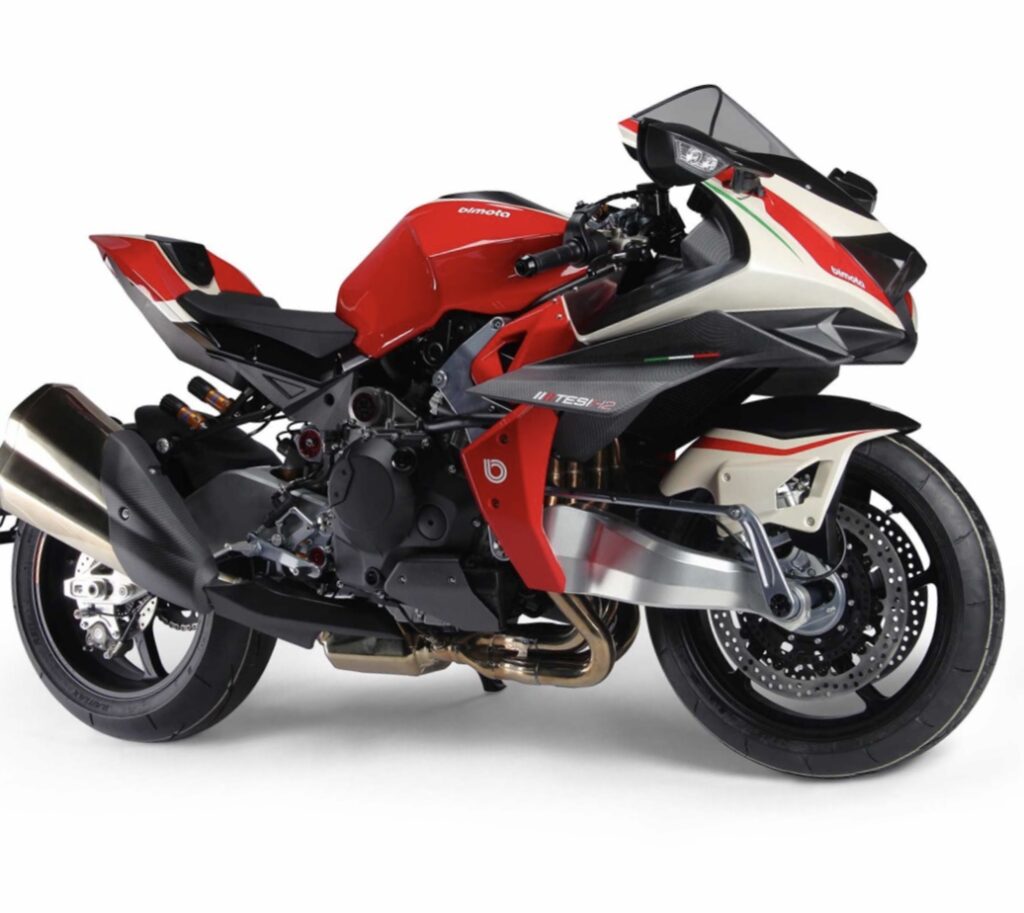The Tesi H2 concept machine, created as a collaboration between Italy’s luxury motorcycle brand Bimota and Kawasaki Heavy Industries.