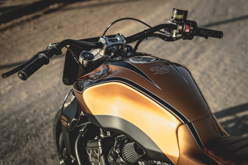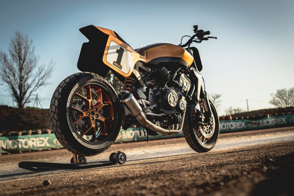 Fireblade-derived inline four powers the tracker with 143 hp. The air box has been replaced by free-flowing pod filters, the exhaust is completely custom and fueling has been appropriately remapped. It features a custom tail and tank.