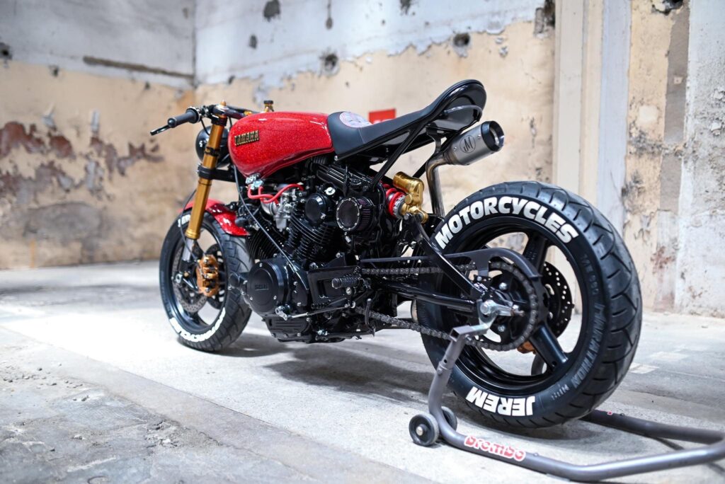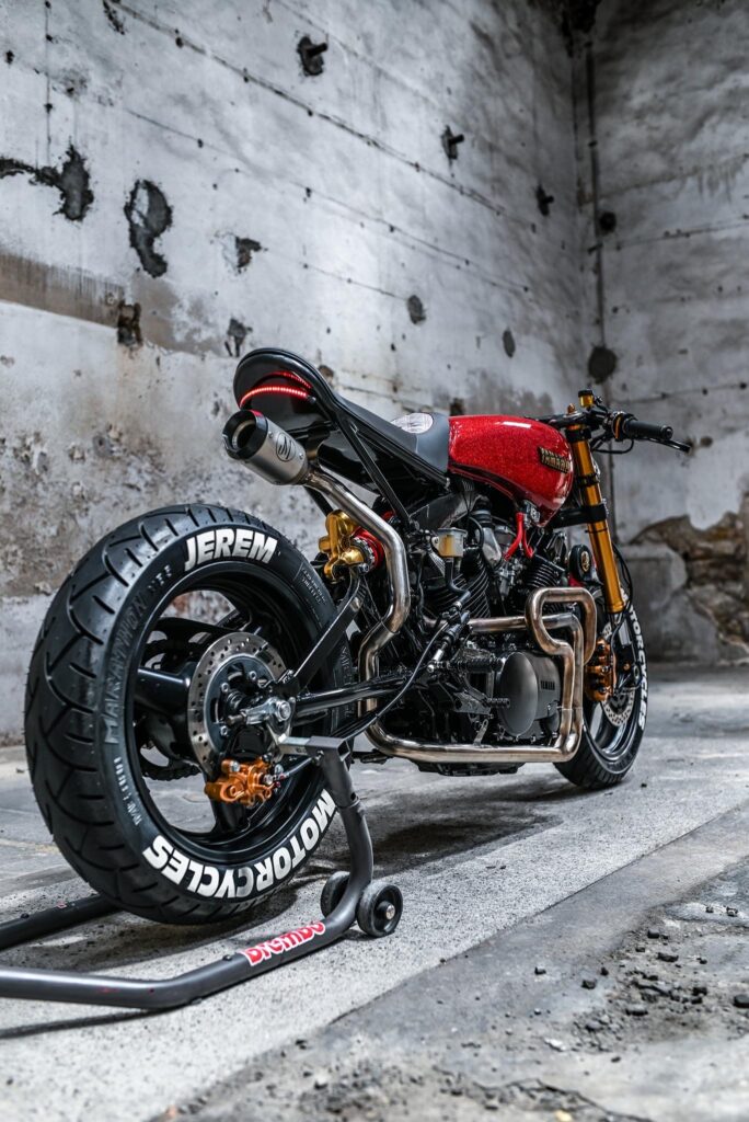 Jerem Motorcycles based out of France customized an XV1000 TR-1. Engine and carburetors were rebuilt, tank has been replaced by a Yamaha XV750 tank and new Tokico calipers with Brembo master cylinder.