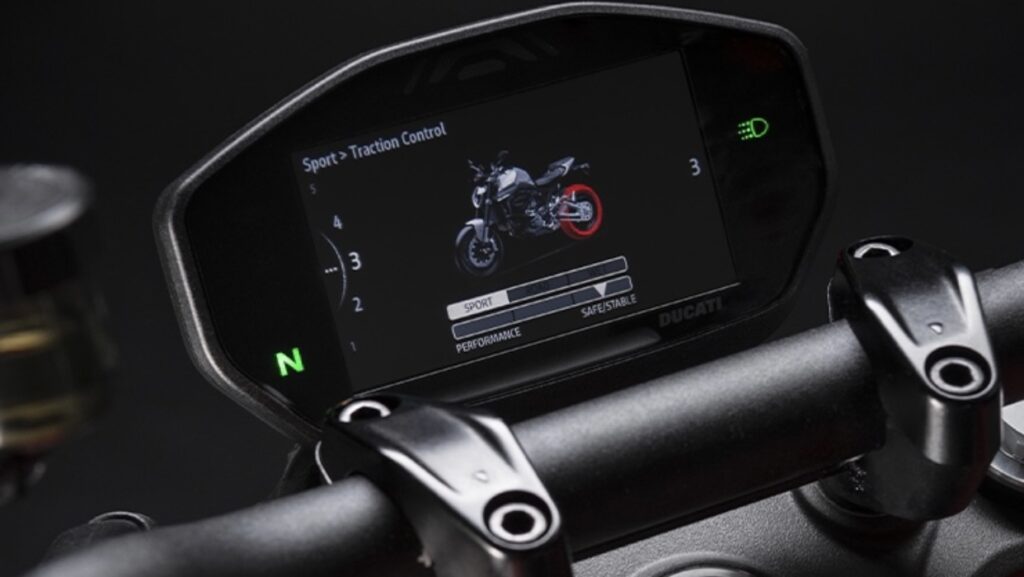 All new 2022 Ducati Monster is equipped with 4.3” colour TFT display derived from Panigale V4 which displays vital on-board information including rev counter, gear position indicator, air temperature and fuel level. Displays Ducati Multimedia System (DMS), which allows to connect the smartphone to the motorcycle via Bluetooth and to manage functions via the buttons positioned on the handlebar.