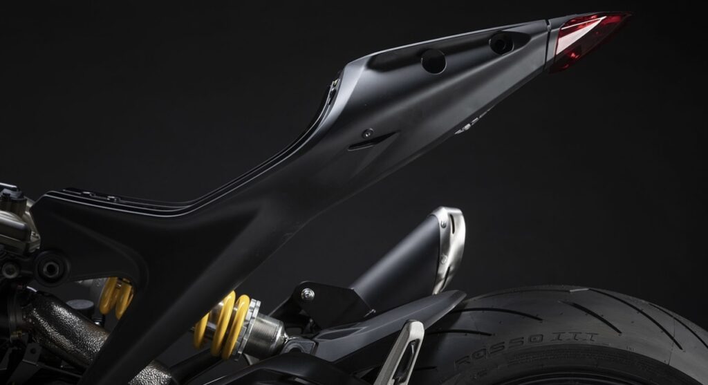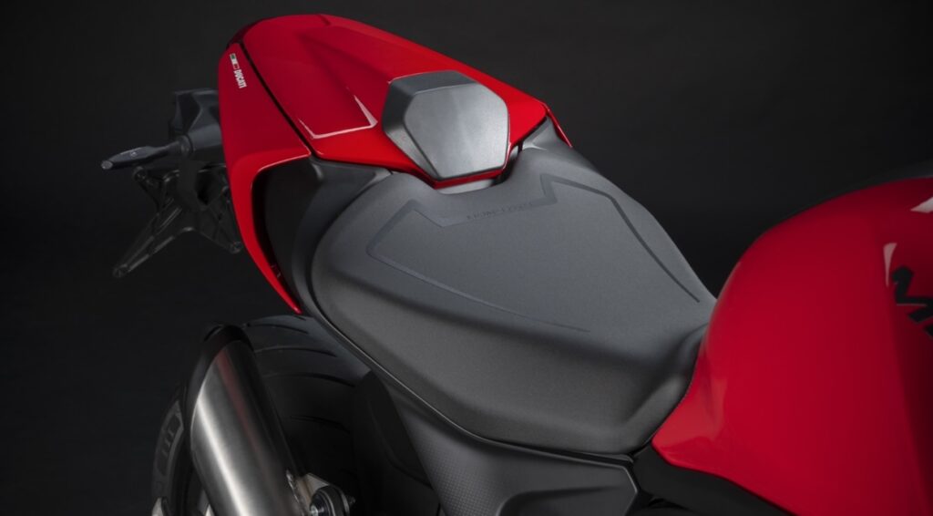 The light-weight aluminum chassis derived from Panigale V4 improves the handling and ride comfort. The short tail, essential and appealing, has a visible rear frame with both a structural and aesthetic function, in addition to two painted side panels inspired by the Panigale V4. Front suspension is a 43 mm diameter fork that provides 130 mm of travel to the front wheel. The adjustable rear shock absorber ensures that the rear wheel is having 140 mm of travel. Braking power is provided by twin Brembo M4-32 4-piston monobloc calipers that grip 320 mm discs at the front and at the rear a single 245 mm disc gripped by a Brembo caliper; like the front brake, it features enhanced-efficiency sintered brake pads.