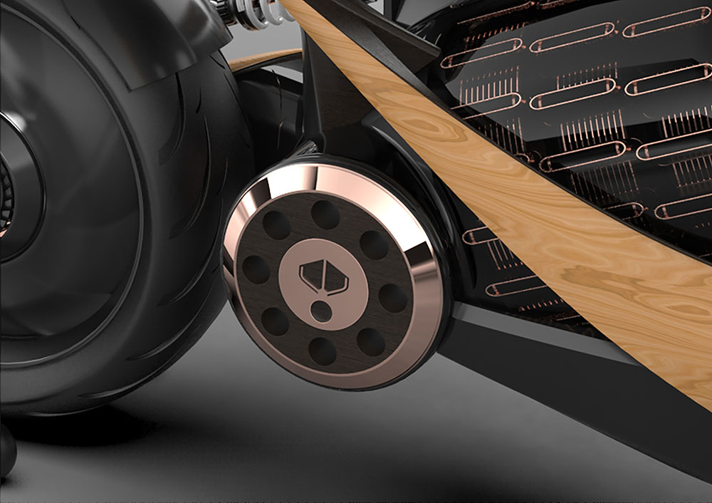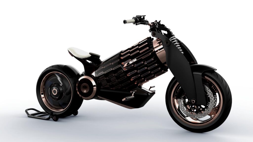 EV-1 features low seat height, comfortable riding position and high-end suspensions. The exoskeleton chassis is linking the front-end to the rear-end through a structural battery.