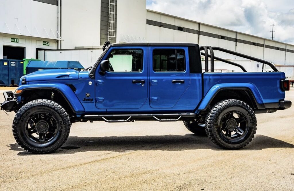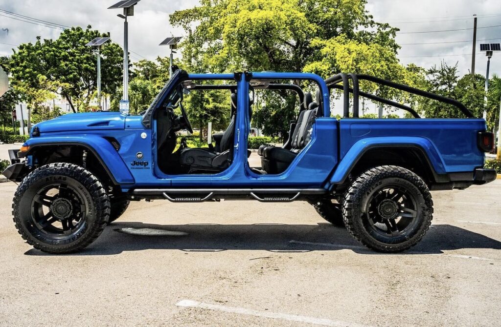 South Florida Jeeps has one such vehicle, a modified Jeep Gladiator with elevated 38-inch tires, 20-inch black SFJ wheels, and a steering stabilizer. It also has a steel front bumper with a winch, a 52-inch light bar, HALO headlamps, a Raider hood, and a Kevlar-coated aluminum roll cage. The interior is upholstered in black leather with blue diamond stitching.