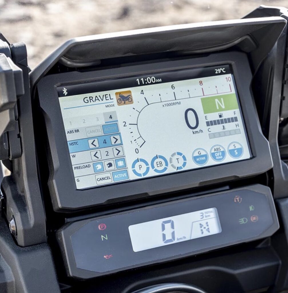 The new Africa Twin is powered by a liquid-cooled, parallel-twin engine gets an 86 cc increase in displacement to a 1,084 cc. The result is a peak power boost from 94 to just over 100bhp and a 6% torque increase to 77.4ftlb. The Africa Twin uses a unique twin air-intake design with two vertical filtration elements.
