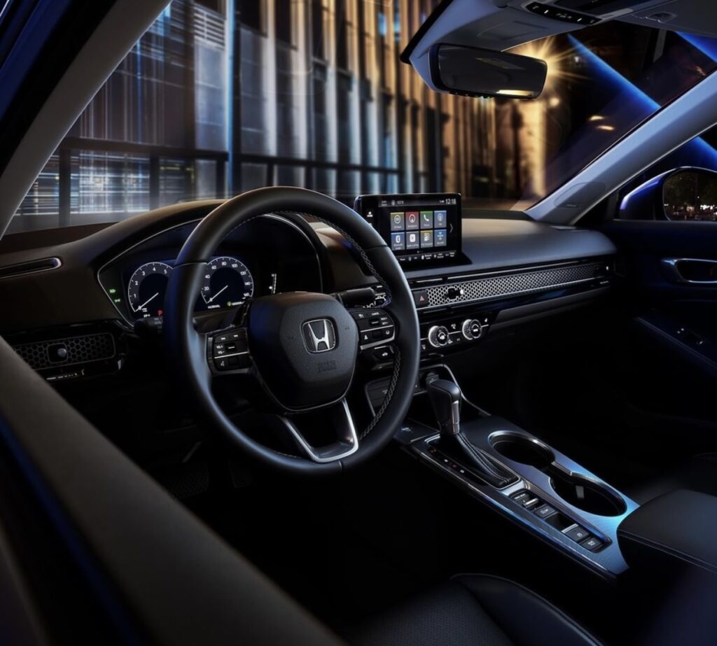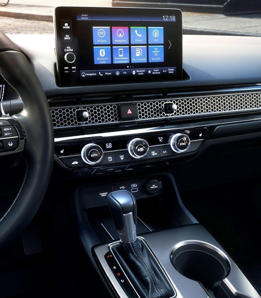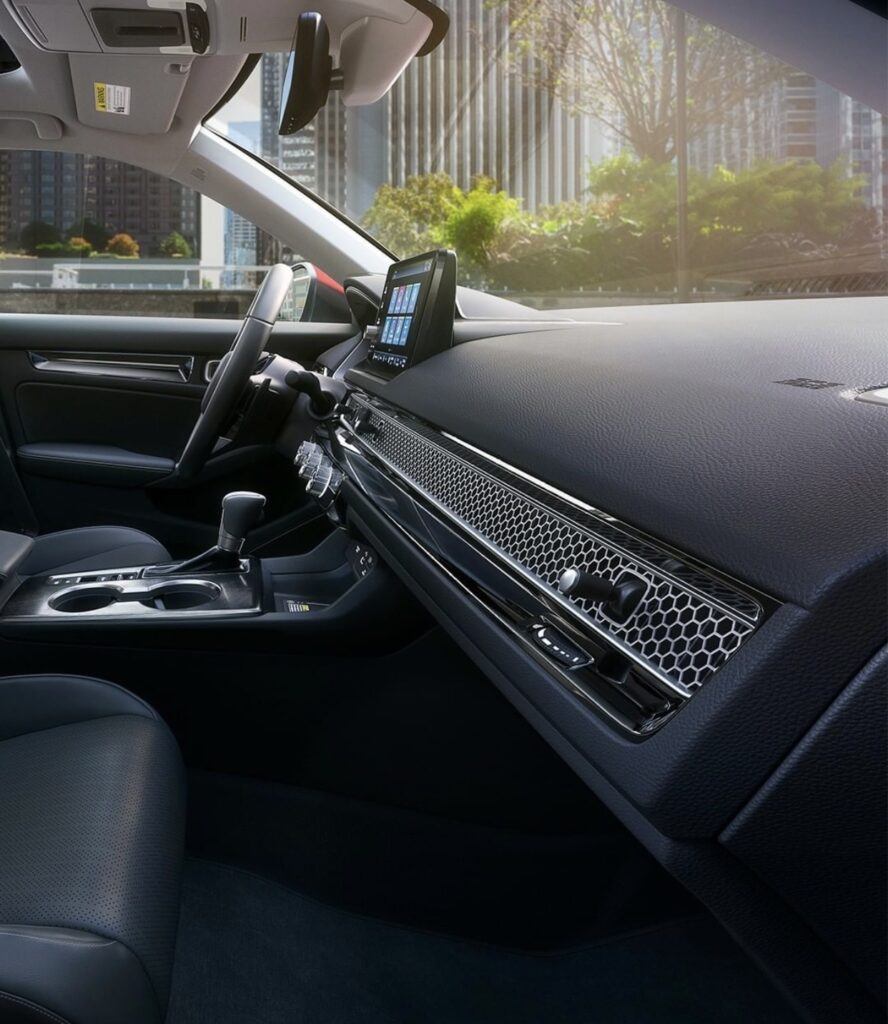 2022 Civic boasts a well equipped interior ample head, leg, shoulder and hip room for all passengers mainly due to the low, flat beltline and uncluttered design. High-quality materials are used throughout the interior. LX, Sport and EX grades are equipped with a 7-inch color LCD instrument display whereas Touring models gets 10.2 inch high-definition full-color LCD panel display. Touchscreen systems come standard with wireless Apple CarPlay and Android Auto integration, while Touring comes standard with Qi-compatible wireless charging. Touring trims are equipped with Bose premium sound system with 12 speakers.