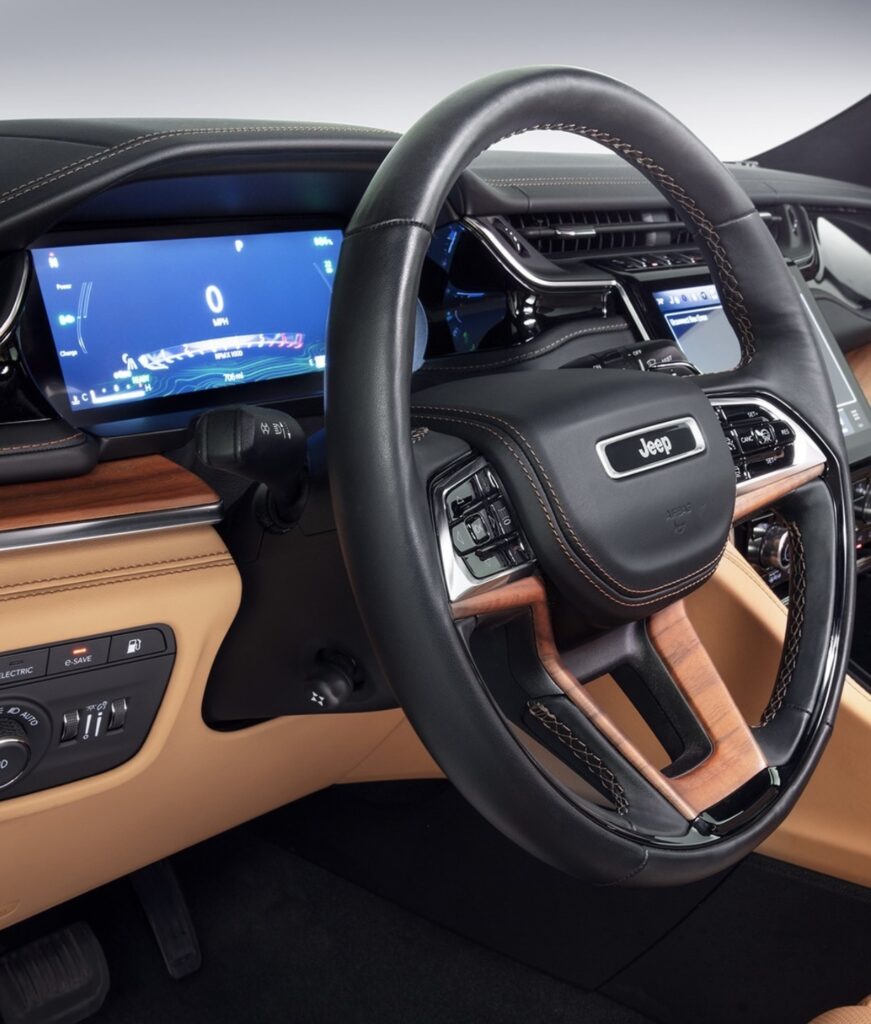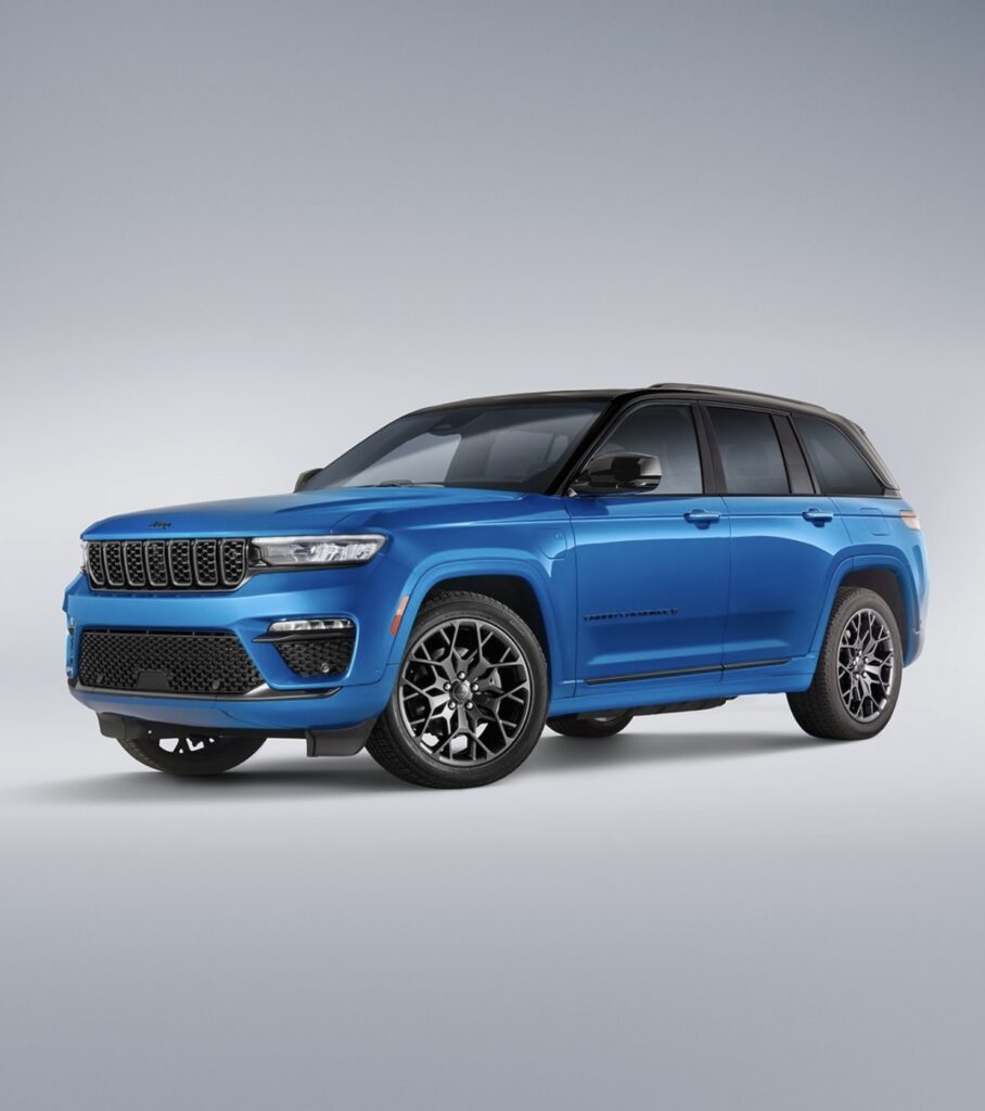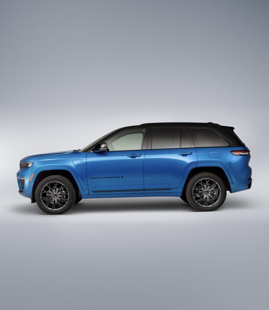 The high altitude trim sports 21-inch black-painted aluminum wheels, black roof rails, black accents, exclusive 7-slot grille and a new hydro blue pear paint scheme. Grand Cherokee 4xe is powered by a 2-liter turbo charged 4-cylinder engine coupled with two electric motors fed by a 400 volt battery.