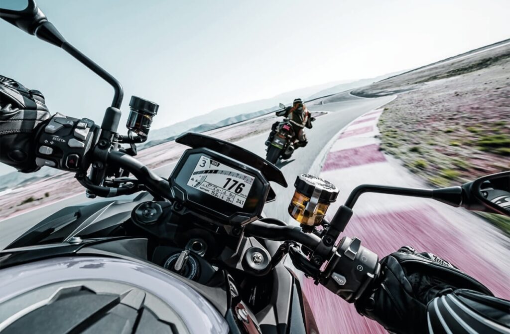 Full LED lighting, a 4.3″ full-color TFT display with smartphone connectivity, ride modes (Sport, Road, Rain), power modes (Full/Middle/Low), traction control, cornering ABS, launch control, cruise control, and a Bosch six-axis IMU round out the tech features.