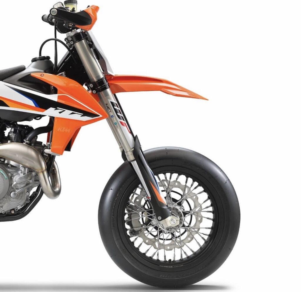 KTM 450 SMR is equipped with Brembo’s four piston radially mounted caliper and supported with Brembo’s radial master cylinder working together with a 310mm front disc. A single piston caliper and 220mm disc is fitted to the rear.
