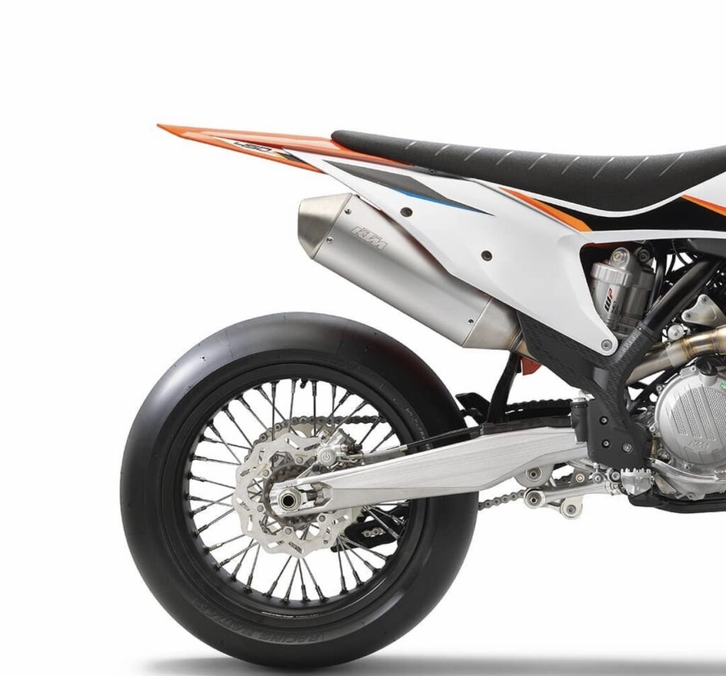 KTM 450 SMR is fitted with the light weight WP XACT with AER technology and feature updated settings for Supermoto use. Rear swingarm offers wide range of adjustment for the rear wheel.