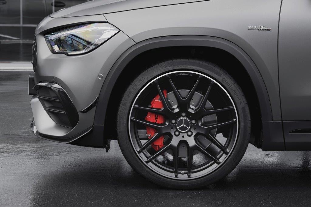 GLA 45 sports 19-inch light-alloy wheels in a 10-spoke design (S-Model 20-inch wheels in a 5-twin-spoke design) and the door panels with inserts in silver chrome or high-gloss black (optional) are particularly striking. As an option, this compact Performance SUV can also be fitted with 21-inch light-alloy wheels.
