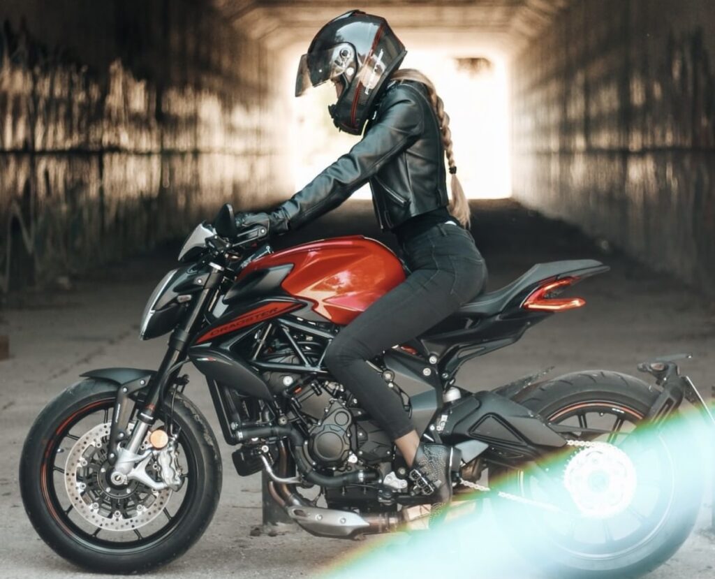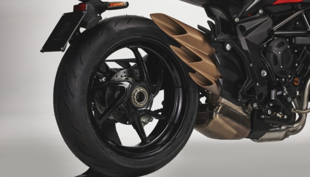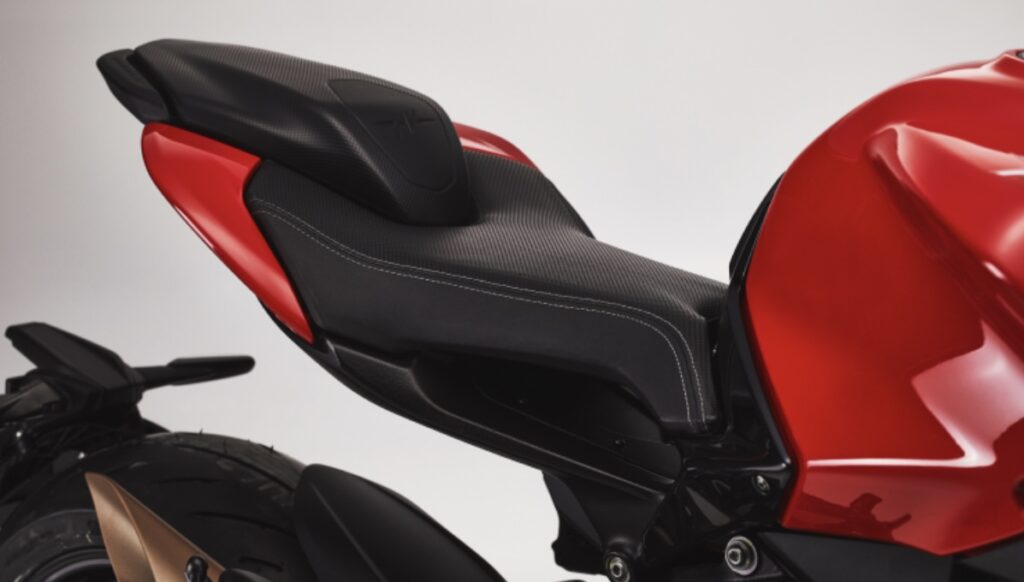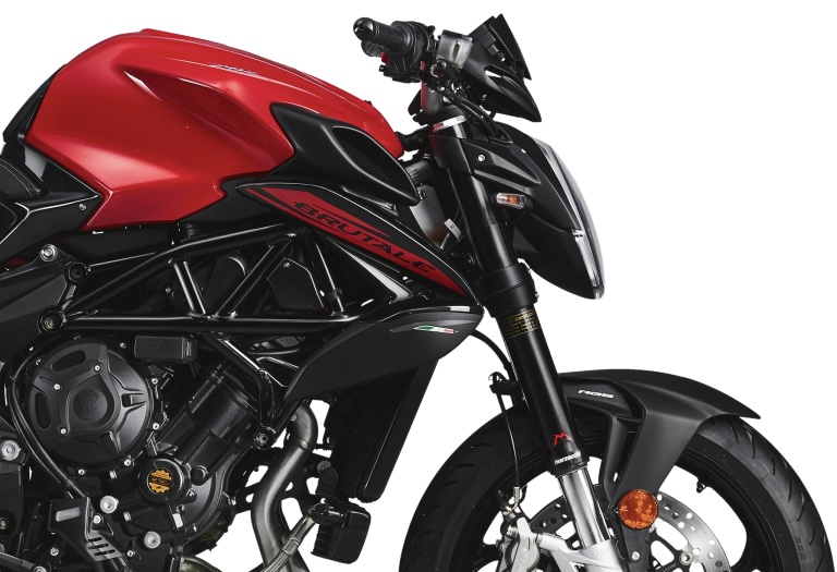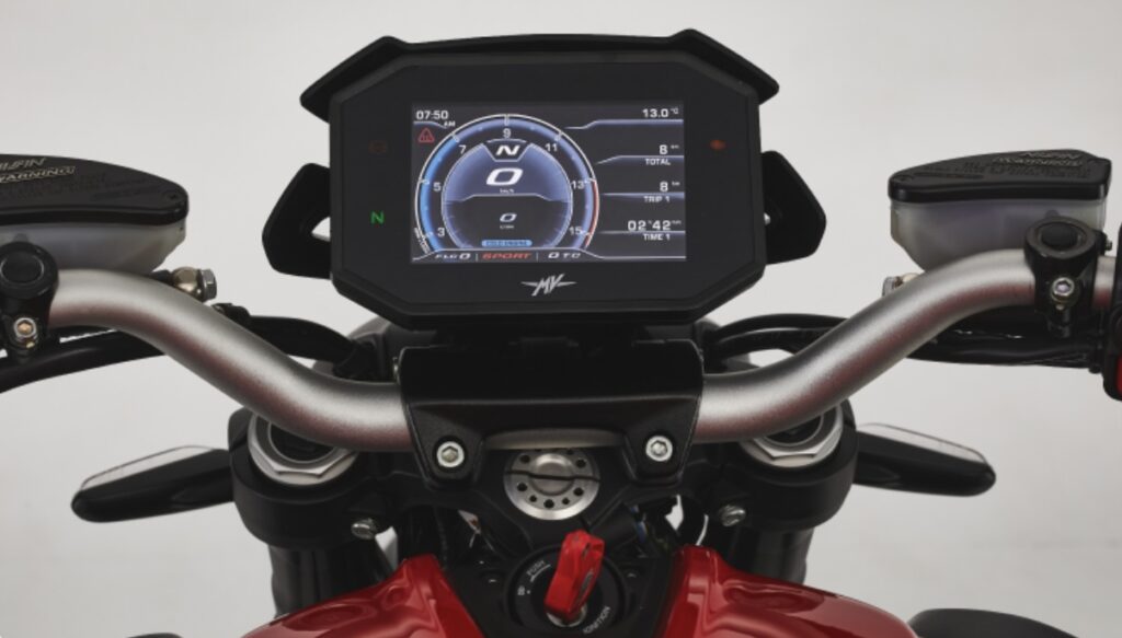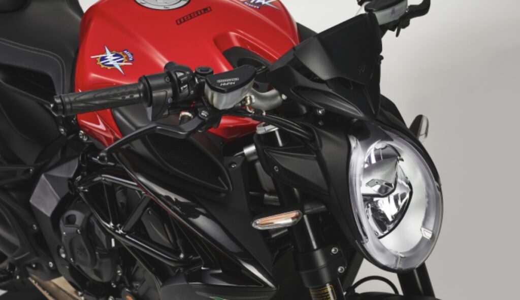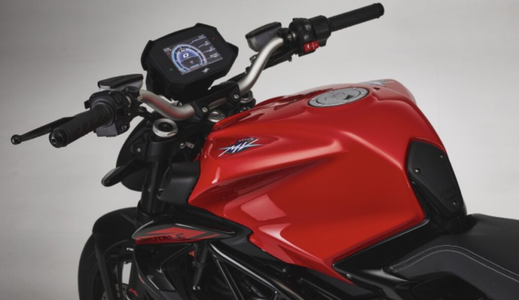 A 798cc triple-cylinder engine with 110 horsepower and 60.5 lb-ft of peak torque powers Brutale Rosso. The sleek roadster excels in handling and maneuverability thanks to its four riding modes—Sport, Race, Rain, and Custom—and eight levels of traction control.