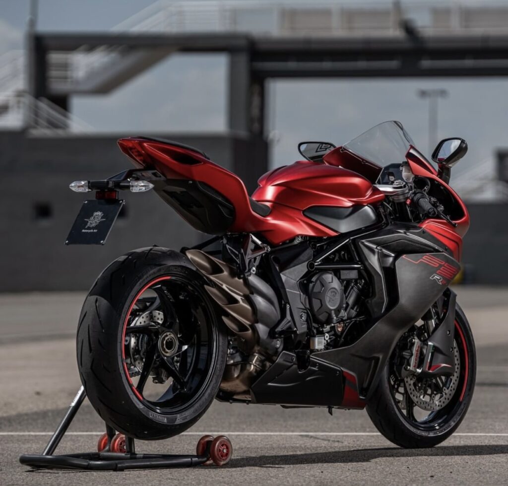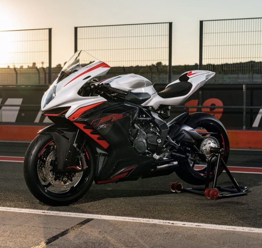 2022 F3 RR is powered by 798cc three cylinder DOHC engine generating 147hp @ 13,000 rpm and 88Nm of torque @ 10,100 rpm. The updated “Trepistoni” engine is equipped with new titanium valves and crankshaft main bearings reducing inertia and friction at high speeds. The new F3 RR features a redesigned exhaust, upgraded electronics suite by the introduction of IMU intertidal platform designed and engineered exclusively for MV Agusta. Also boasts a new suspension setting and new wheels.