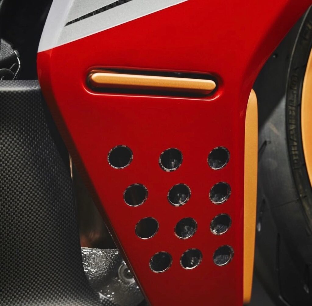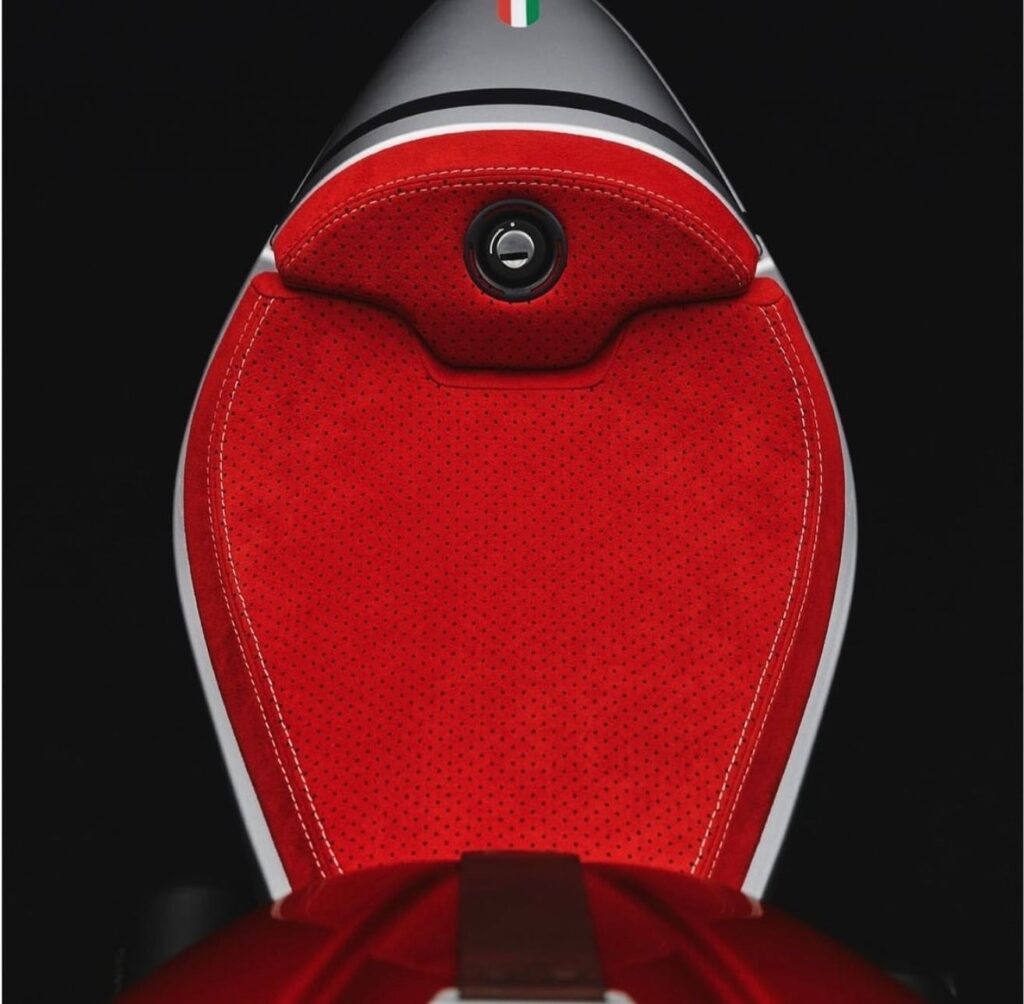 The one-off Testalarga will accelerate from 0 to 100 kilometers per hour in 3.05 seconds and from 0 to 200 kilometers per hour in approximately 9 seconds. The photographs reveal the red, white, and gold color scheme, as well as the perforated seat, fairings, and gold-colored wheels encased in Pirelli tyres.