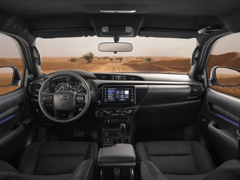 Inside the vehicle the muscular black interior that comes with a new multi-information display and 8.0-inch centre console infotainment unit, with the latest suite of software and graphics enhancement plus Apple CarPlay and Android Auto integration. The rear of the Hilux Adventure comes with rear bed-liner and tonneau cover as standard as well as a rear-view camera, parking sensors, parking support clearance sonar, LED rear combination lamps and on-board air compressor.