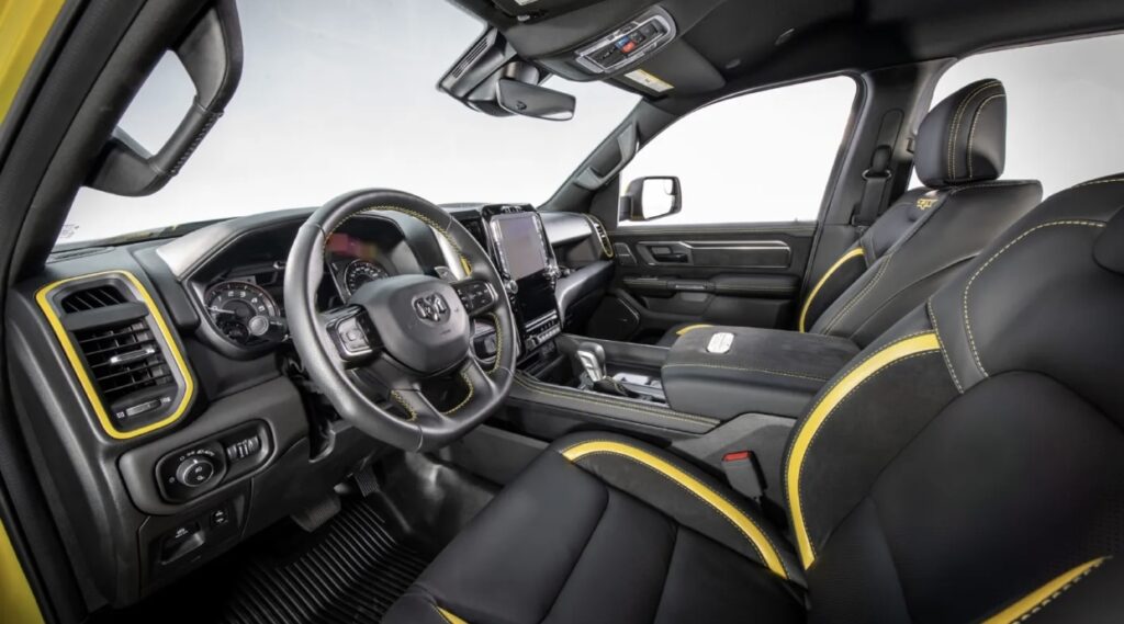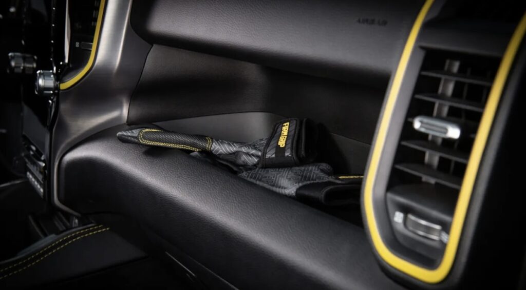 Mopar and TRX emblems are embroidered on the outboard shoulder bolsters of both front seats’ upper back panels, respectively. Perforated Alcantara suede inner bolsters and quality Capri leather wrap the seats. Black front and rear seats are contrasted boldly with gold Spinneybeck leather chaser stripes that match the exterior.