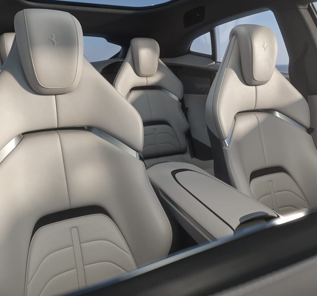 The interior architecture of the Purosangue is based on the dual cockpit dashboard concept inspired by the SF90 Stradale, with a 10.2″ display that gives all necessary information. The Burmester 3D High-End Surround Sound System also makes its debut as standard equipment in Ferrari Purosangue