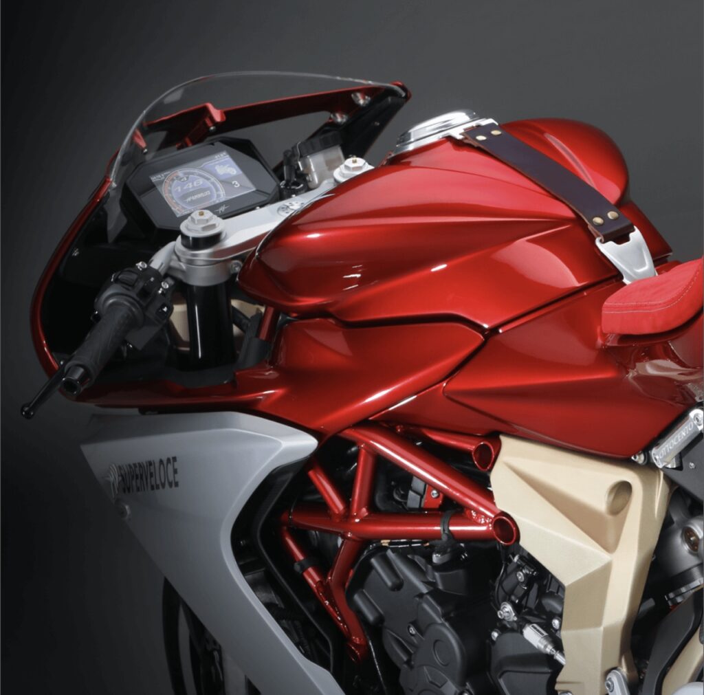 The chassis architecture, engine and braking system are directly derived from the speedy MV Agusta F3 800, with some slight changes that enhance the performance and driving experience of the new Superveloce 800 Serie Oro. The Superveloce 800 Serie Oro engine has been entirely remapped to enhance power characteristics. 3 cylinder 798cc engine delivers 148 hp and 8.97 Kgm of torque.