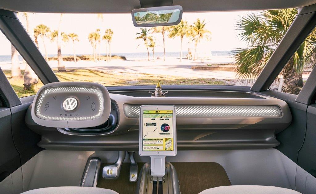 The I.D. Buzz concept sports 369 hp from electric motors on each axle that also provide all wheel drive and the 111 kWh battery pack in the floor of the MEB chassis provide nearly 300 miles of estimated range. Using a VW fast-charge system, it can recharge about 80 percent of its energy capacity in 30 minutes at 150 kW. The I.D. Buzz concept also offers a preview of the type of autonomous technology that VW will develop for future models – namely its fully automated “I.D. Pilot” mode that could go into production by 2025. From the fold-away steering wheel and pop-up laser scanners in the roof to a heads-up display that integrates augmented reality, the I.D. Buzz does not lack for innovation