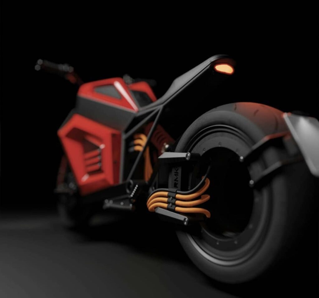 This hubless rear wheel offers 737 lb-ft of torque to the ground. If you are looking for rear brakes, the motor becomes a generator and stops the bike while recharging the battery.