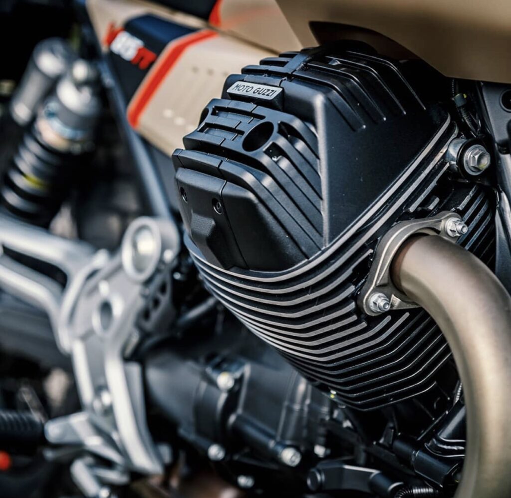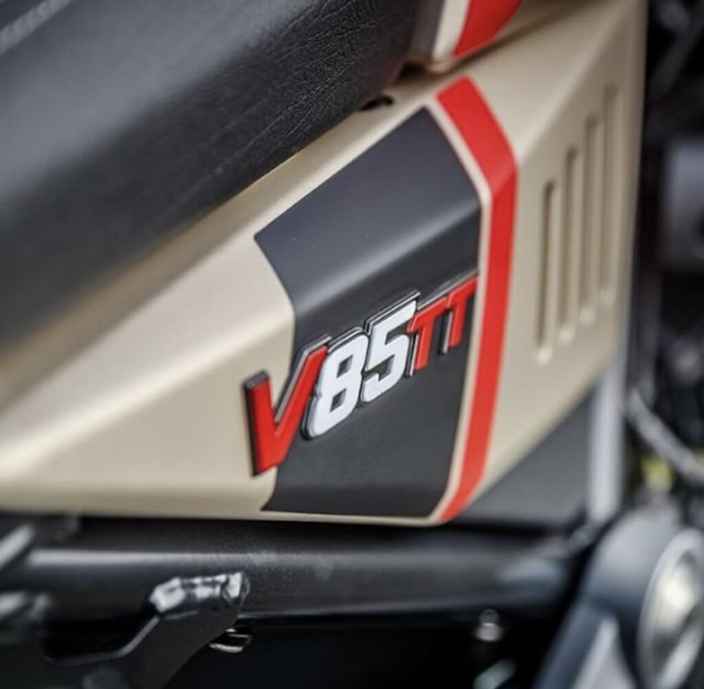 V85 TT is powered by 853cc air-cooled 90° transverse V twin with OHV distribution and two valves per cylinder, belts out 80hp @ 7,750 rpm.