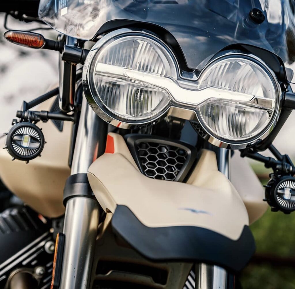 The V85 TT is seamlessly mixes the great classic styles of the off-road world with advanced technological elements such as the digital instrument cluster and full LED lighting. The DRLs on the front headlamp are adorned with a clearly delineated silhouette of the celebrated Moto Guzzi eagle.